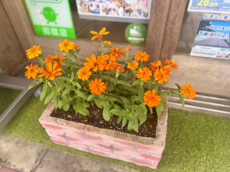 今回は、ジニア(百日草)の鮮やかなオレンジ色を植えました!