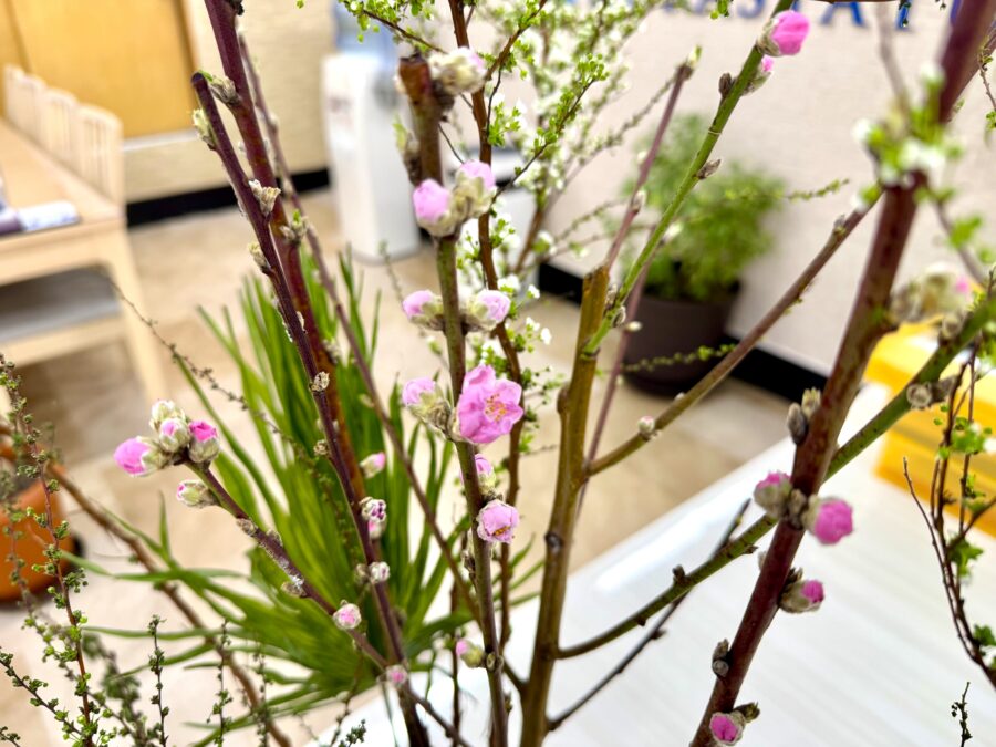 中心に生けられているのは、ひな祭りに欠かせない 桃の花。